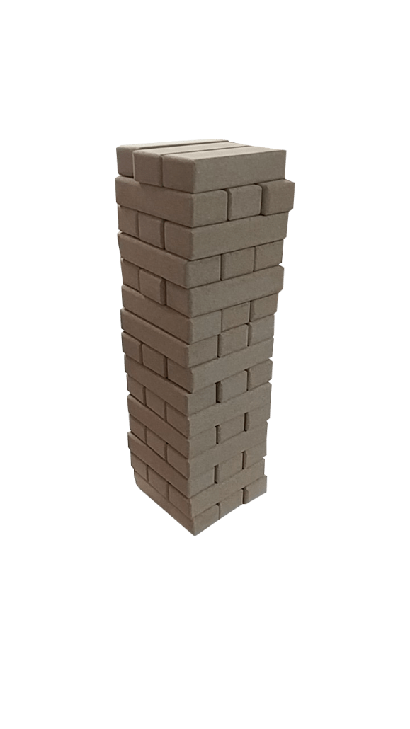 45 pieces in High Density Premium Rounded Cork. This is half the weight of the wood sets and very durable standing at 30″ tall. These are precision cut and sanded with an extremely fine sanding for the blocks to slide easily & efficiently. The Tumbling Tower Cork Edition starts at 9″x 9″x 30″ (Plays Up to +5ft tall) once the 2×3’s are stacked. The blocks in stacking play can reach well over 5+ft tall. This game is ideal for the younger crowds that prefer not to play with the heavier wood blocks, want to enjoy a life size lighter version, chip resistant, water resistant, and marker/paint pen decor ready set.