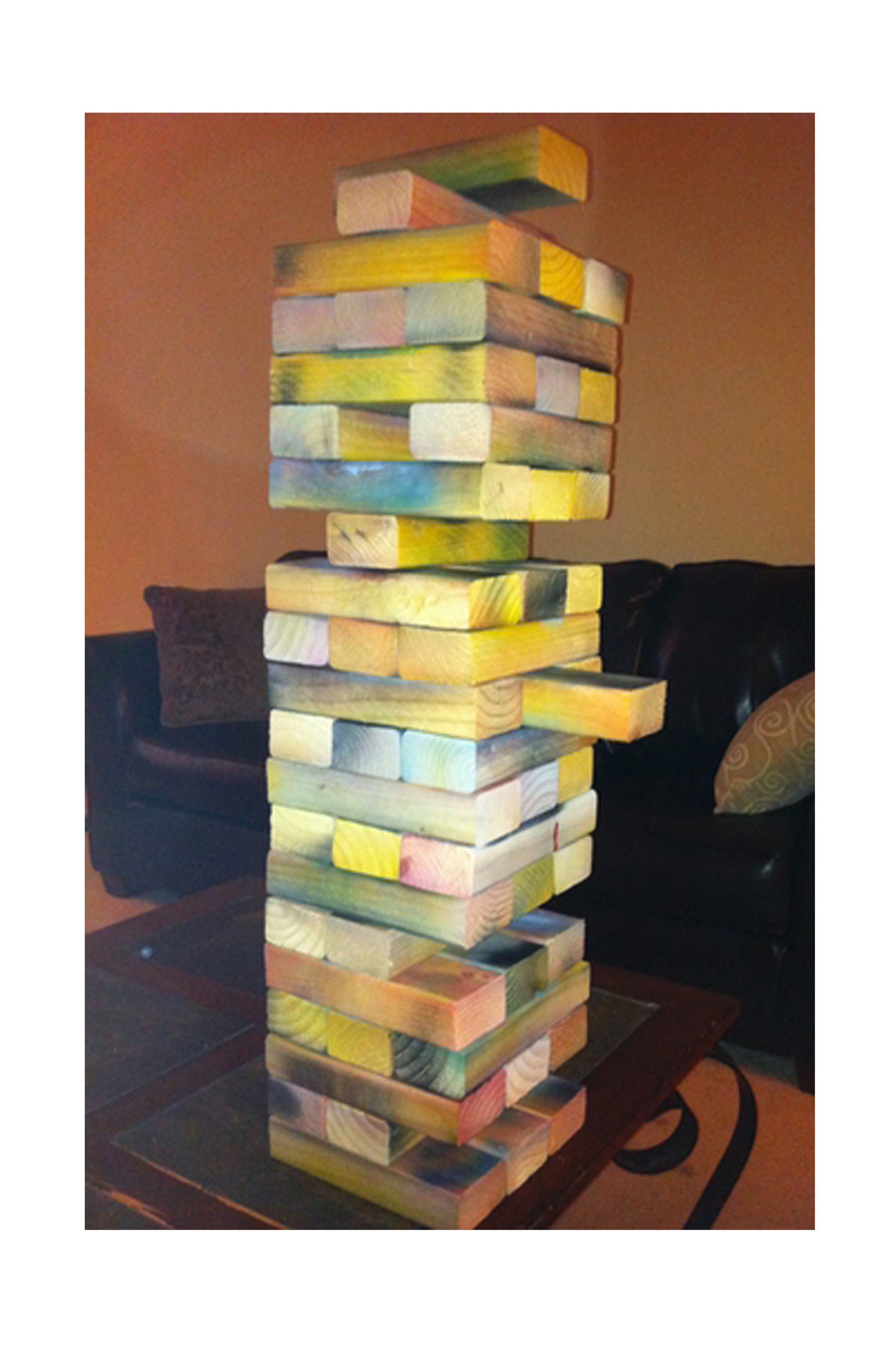Includes 54 Large pieces all "Custom Graffiti Sprayed" with multi-Color Graffiti style, Decorated for GIANT-Tumbling Tower Fun, 7.5"x 7.5"x 27" - (18 rows) starts at 2.5ft Tall, and can stack up to 4+ft during play.