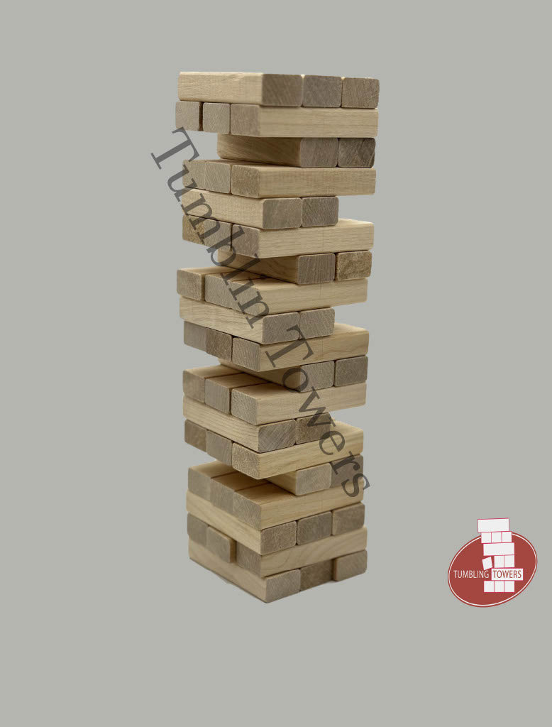 This is Small Tumbling Towers Table Top Wood Game with plain Acrylic case (This purchase includes x1 unit customized with your logo on each block x1)- Available with any Single Color CUSTOM Logo on each block. This purchase includes 54 pcs and 18 rows of Tumbling Tower Fun.